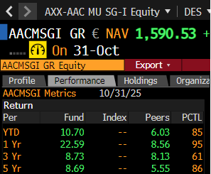 Das AAC-Portfolio beendete einen recht volatilen Monat Oktober mit einem guten Plus von 2,7%. Damit liegt der Fonds für das laufende Jahr mit einem Anstieg von über 10% bei einem 2-stelligen Zuwachs. Dank der rechtzeitigen Auflösung der Währungsab-sicherung im USD und der schnellen Gewinnmit-nahmen bei den Goldwerten, konnte der AAC-Fonds in den letzten zwei Monaten mehrfach in Folge ATHs (All-Time-Highs) vermelden und schloss am Monats-ende in unmittelbarer Nähe neuer ATHs.
