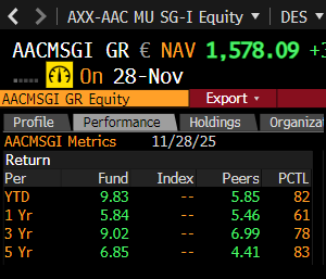 Zum Monatswechsel (Anfang Dezember) liegt der Investitionsgrad im AAC-Fonds bei ca. 85 %. Wir nutzen die Cash-Bestände aus den Tech-Verkäufen für gezielte Reinvestitionen in die Sektoren, die eine neu auf-kommende relative Stärke aufweisen. Der strategische Shift im Portfolio stellt sich wie folgt dar: Reduziert: US-Technologie Fokus neu: Bio- & Gentechnologie sowie Rohstoffwerte (Gold, Öl, Lithium, Seltene Erden). Mit Blick auf die Saisonalität in Kombination mit den weiter soliden Makrodaten könnte sich per 01.12.2025 durchaus noch eine Jahresendrally ergeben. Sollte dies der Fall sein, wird das Exposure im Fonds wahr-scheinlich in Richtung 90% ausgebaut.